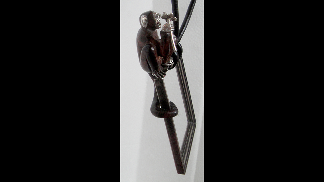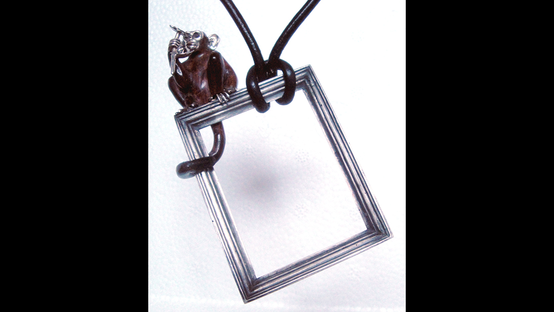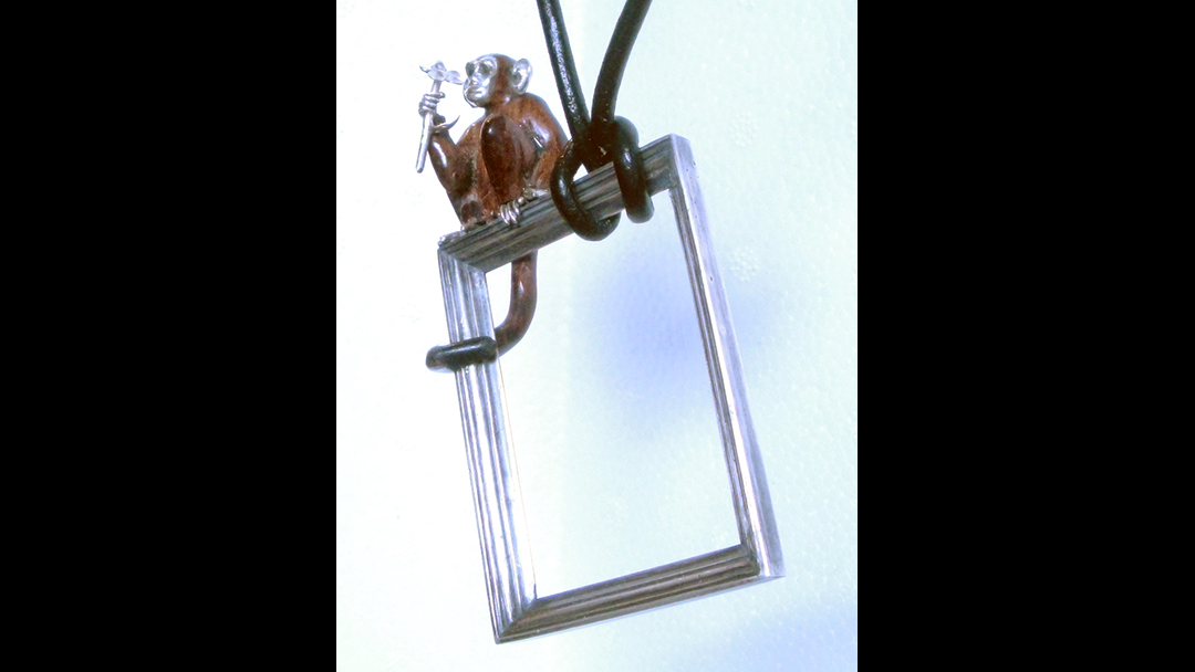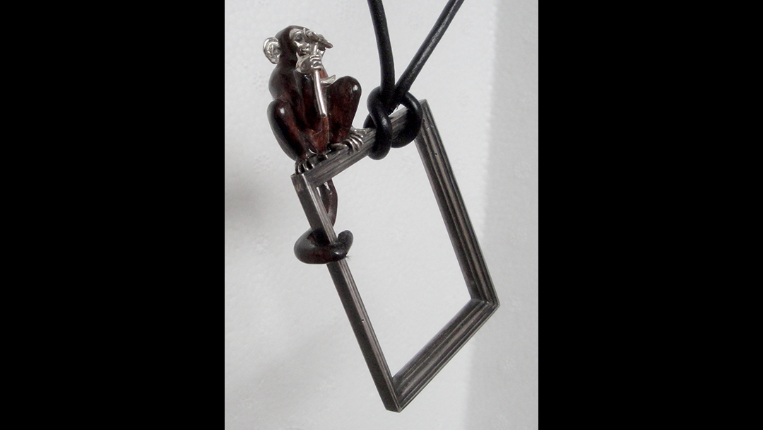 The Monkey That Don’t Fit the Frame Simply Artist Home > Portfolio > Jewelry > The Monkey That Don’t Fit the Frame by trulaf | Dec 8, 2025 | 0 Click on the image to see a larger photo. “The Monkey Don’t Fit the Frame” is a pendant. The picture frame is cast silver. The monkey sitting on top is carved from snake wood, and its face, hands, and feet are carved in silver. Size: 3″ (7.5 cm) high Price: This is for sale Completed: 2025 Portfolio